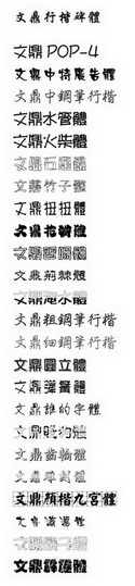 文鼎習字體、香腸體、瀟灑體、花瓣體、霹靂體、妞妞體、荊棘體、竹子體、中特廣